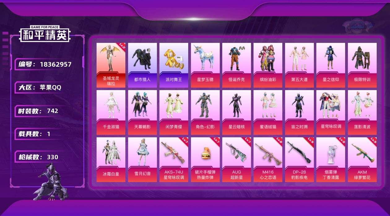 【652826】【可二次】【苹果QQ】星之信仰 龟仙人 AKM-绿萝繁花 星梦玉骢 M762-青锋波束 漫步者 繁龙极客飞行器 怪诞乔克 都市猎人 DP-28-圣堂之誓 AUG-超新星 极限特训 龙翔九天飞行器 黄族统领飞行器 SCAR-L-万古烈焰 M416-心之恋语 圣域龙灵-瑞拉 缤纷油彩 粉红小猪 派对舞王 浪漫天命 暗影哥特 冰霜白皇