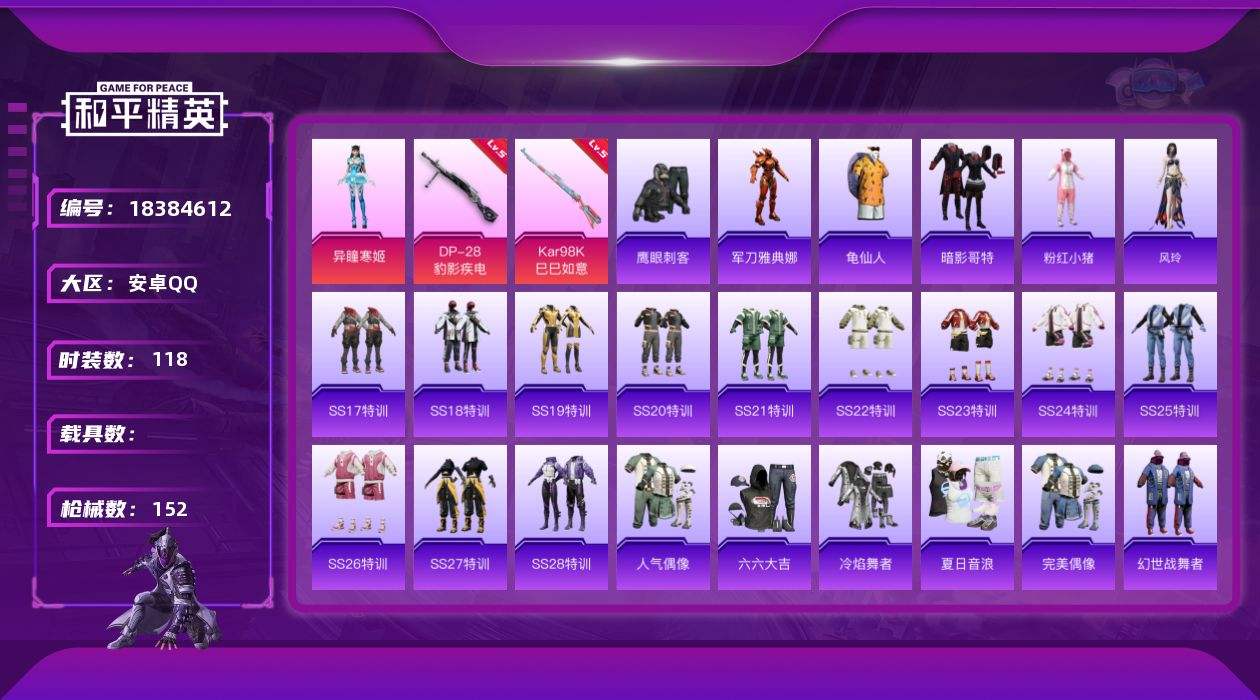 【655513】[18384612]【FK6501】118套装/枪械2/装备158/战备101/王牌印记6/热力值41866/五级Kar98K-巳巳如意/五级DP-28-豹影疾电/军刀雅典娜/龟仙人/暗影哥特/粉红小猪/异瞳寒姬/Kar98K-巳巳如意/DP-28-豹影疾电/炫彩糖果飞行器/环太平洋降落伞/太空嘟嘟降落伞/彩虹甜喵降落伞/精灵梦叶罗丽降落伞/风玲/AKM-彩虹符号/AKM-影袭/