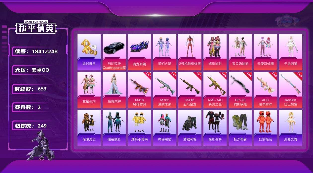 【658590】【可二次】【安卓QQ】水银刺客 M416-五爪金龙 漫步者 海龙奔腾 缤纷油彩 浪漫波比 M24-香水柠檬 瑞龙福将 激萌小黄鸭 AWM-激战未来 醒狮腾龙 梦之呓语 纯梦嫁纱飞行翼 团圆交子 红熊茄茄 M762-激战未来 M762-瑞龙福将 潮萌小黄鸭 狂沙舞者 M416-风花雪月 梦幻火箭 天使彩虹糖 粉红小猪 草莓生巧 宝贝奶油派 派对舞王 神秘黑猫 红螳螂 暗影哥特
