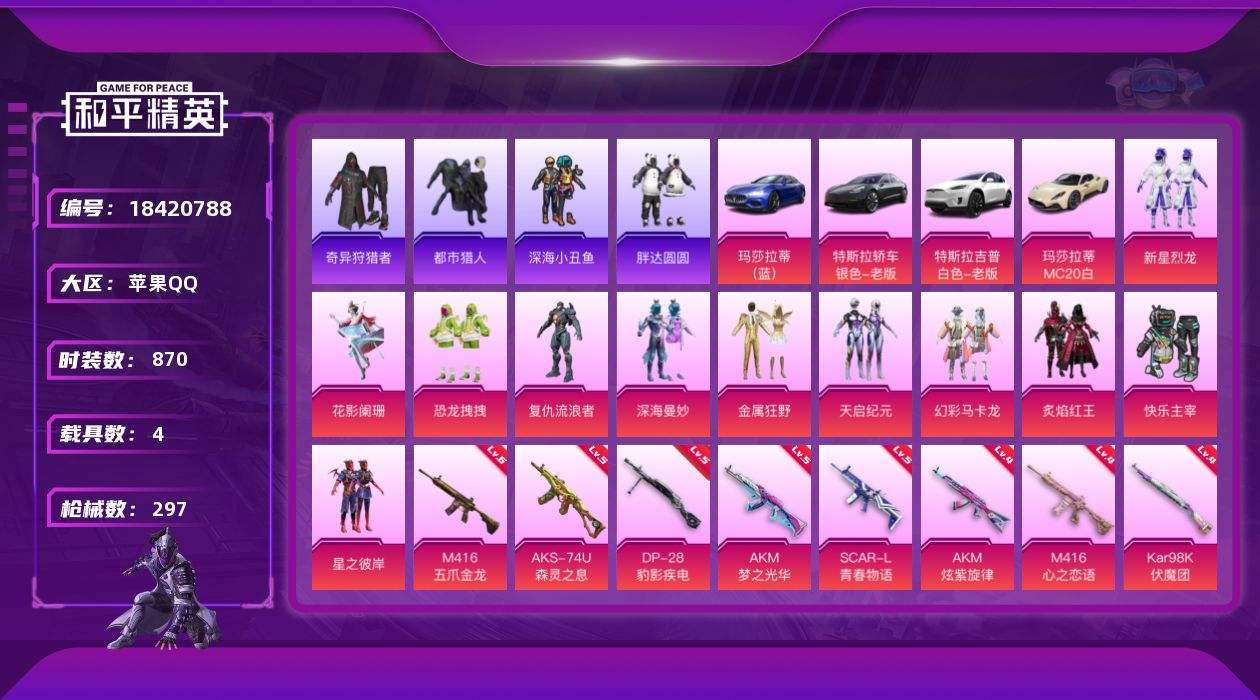 【659463】【不可二次】【苹果QQ】恐龙拽拽 漫步者 都市猎人 M249-古堡领主 特斯拉X白色 金属狂野 M762-奇异狩猎者 快乐主宰 M416-心之恋语 深海小丑鱼 浪漫波比 Kar98K-伏魔团 AKM-奇异狩猎者 幻彩马卡龙 迅捷狂鲨 M762-瑞龙福将 潮萌小黄鸭 黑色刀锋 天启纪元 狂沙舞者 金羽特工 玛莎拉蒂蓝色 AKM-炫紫旋律 白月香洋装 PEL轰鸣竞梦者飞行器 AKM-