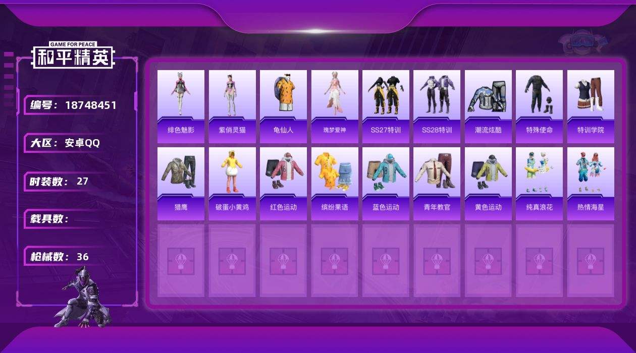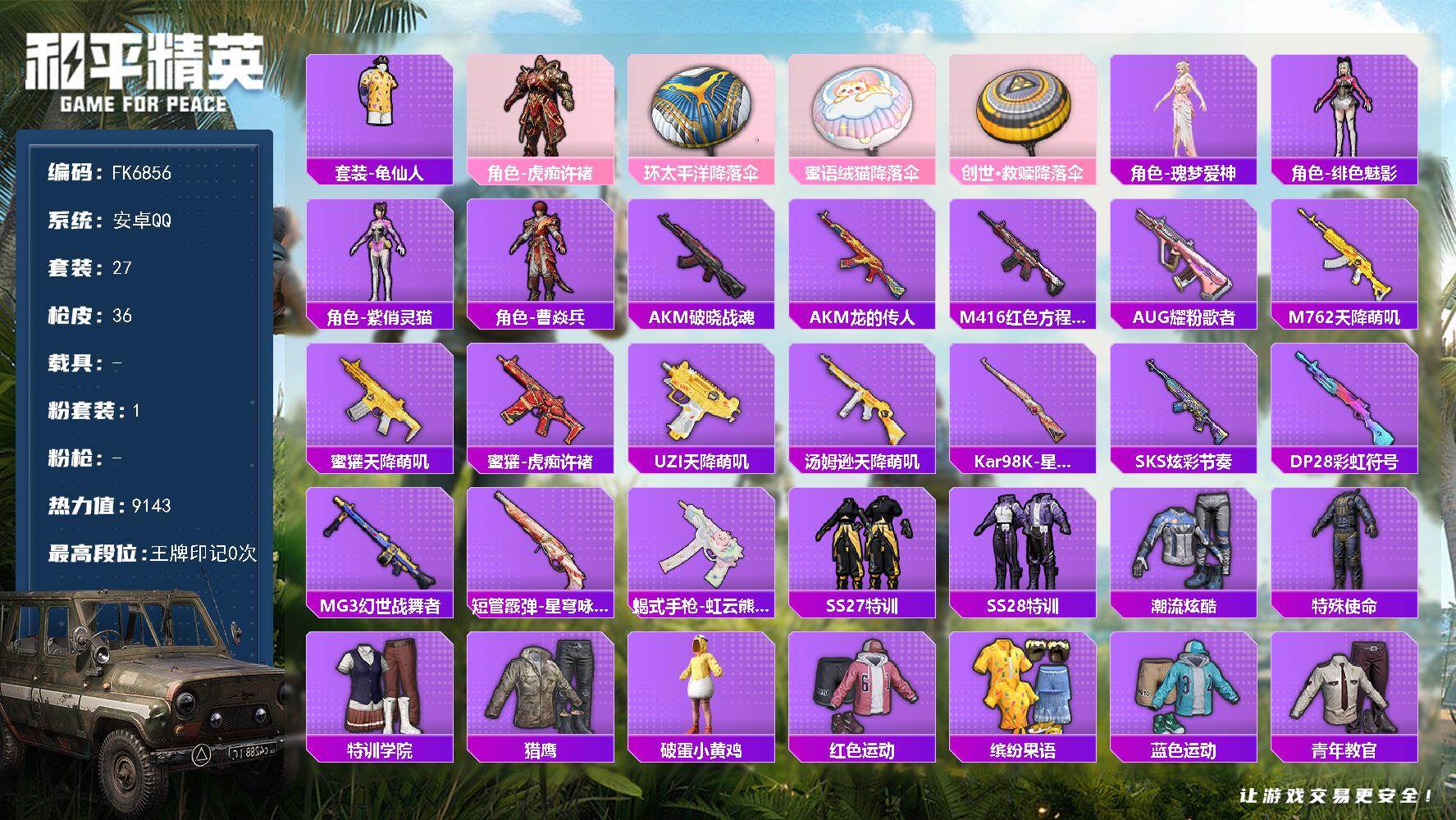 【680356】[18748451]【FK6856】27套装/装备41/战备28/热力值9143/龟仙人/角色-虎痴许褚/环太平洋降落伞/蜜语绒猫降落伞/创世·救赎降落伞/瑰梦爱神/绯色魅影/紫俏灵猫/角色-曹焱兵/AKM-破晓战魂/AKM-龙的传人/M416-红色方程式/AUG-耀粉歌者/M762-天降萌叽/蜜獾-天降萌叽/蜜獾-虎痴许褚/UZI-天降萌叽/汤姆逊-天降萌叽/Kar98K-星穹