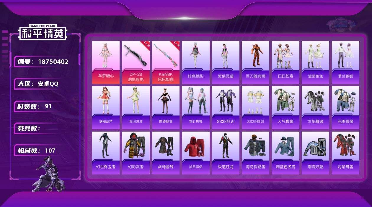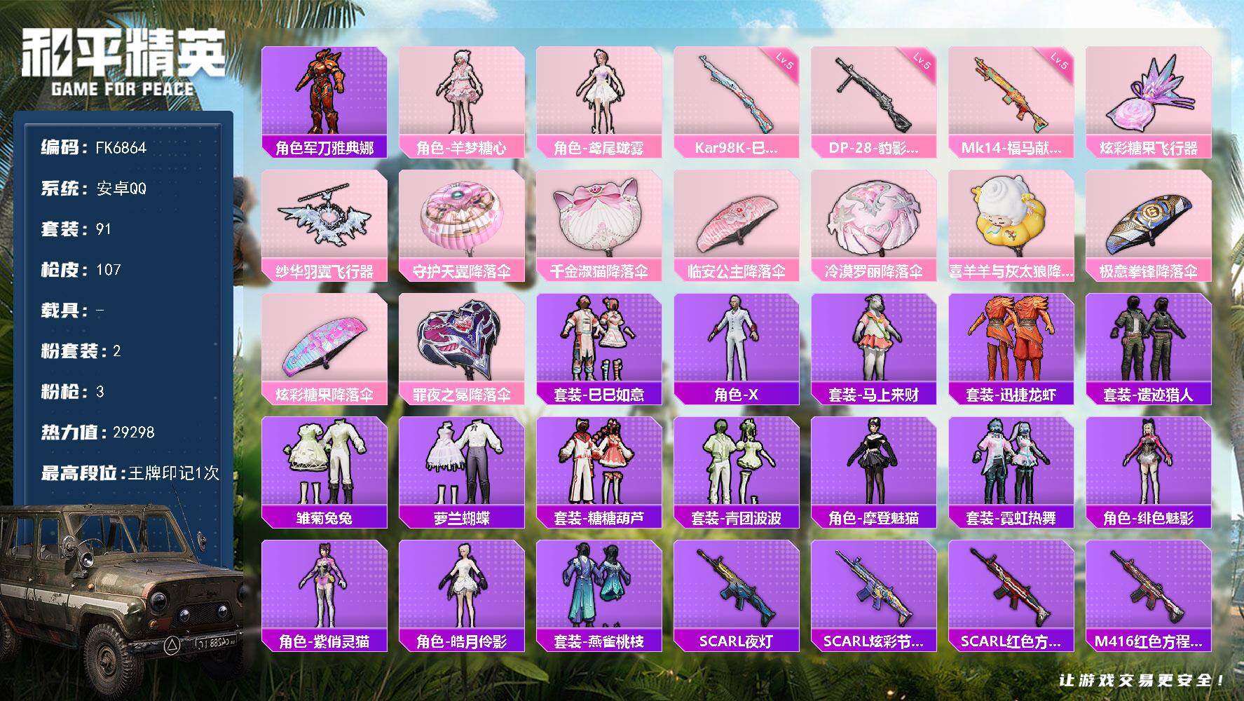 【680733】[18750402]【FK6864】91套装/枪械3/装备128/战备72/王牌印记1/热力值29298/五级Kar98K-巳巳如意/五级Mk14-福马献瑞/五级DP-28-豹影疾电/军刀雅典娜/羊梦糖心/角色-鸢尾珑雾/Kar98K-巳巳如意/Mk14-福马献瑞/DP-28-豹影疾电/炫彩糖果飞行器/纱华羽翼飞行器/守护天翼降落伞/千金淑猫降落伞/临安公主降落伞/冷漠罗丽降落伞