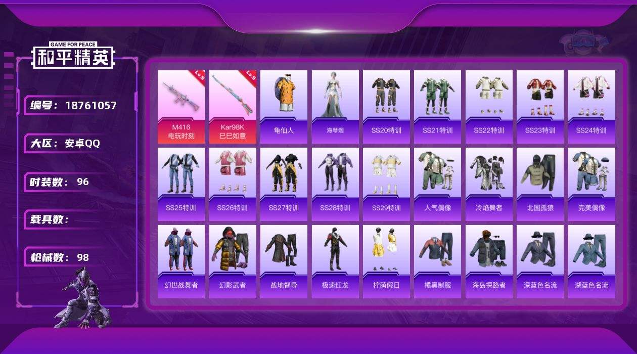 【681920】[18761057]安卓 手Q-1粉装-6特效枪-0载具-0粉色飞行器-28701热力值-3王牌印记-96套装-98枪皮【热门品类】:套装-龟仙人【粉色套装】:角色-鸢尾珑雾【粉色枪皮等级】:M416-电玩时刻(五级),UMP45-萌骑冒险(五级),AKS-74U-森灵之息(五级),Kar98K-巳巳如意(五级),Mk14-福马献瑞(五级),DP-28-鸢尾珑雾(四级)【粉色枪皮
