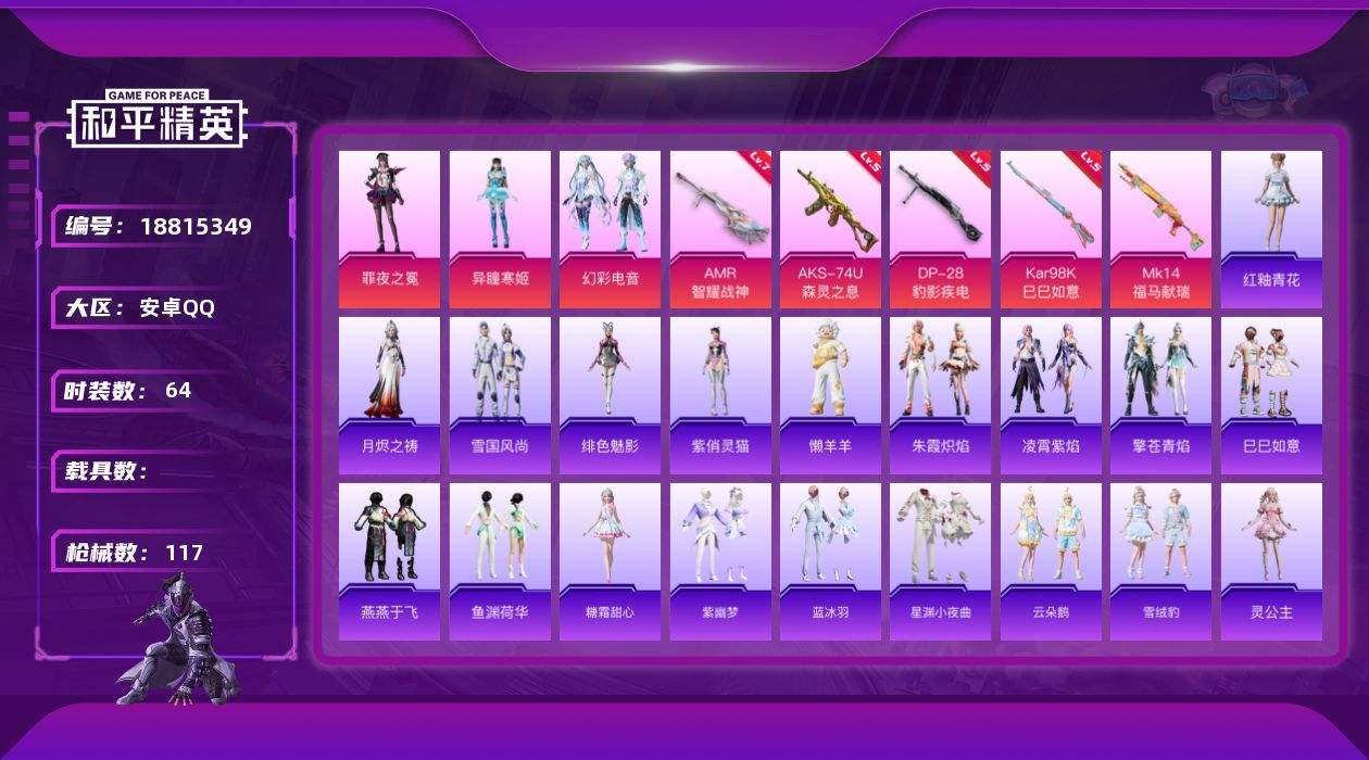 【687701】[18815349]【kyhp563】安卓 手Q-3粉装-6特效枪-0载具-2粉色飞行器-30540热力值-3王牌印记-64套装-117枪皮【粉色套装】:粉装-幻彩电音,角色-异瞳寒姬,角色-罪夜之冕【粉色枪皮等级】:AKS-74U-森灵之息(五级),Kar98K-巳巳如意(五级),AMR-智耀战神(七级),DP-28-豹影疾电(五级)【粉色枪皮】:AKS-74U-森灵之息,Ka