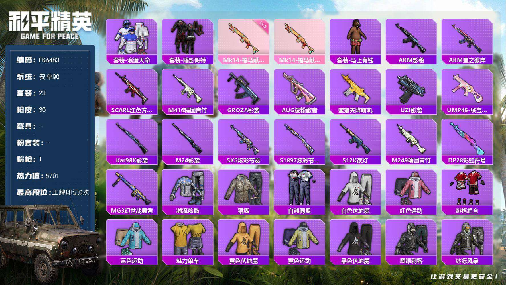 【690919】【可二次】【安卓QQ】UZI影袭 漫步者 AKM影袭 浪漫天命 暗影哥特 都市猎人降落伞