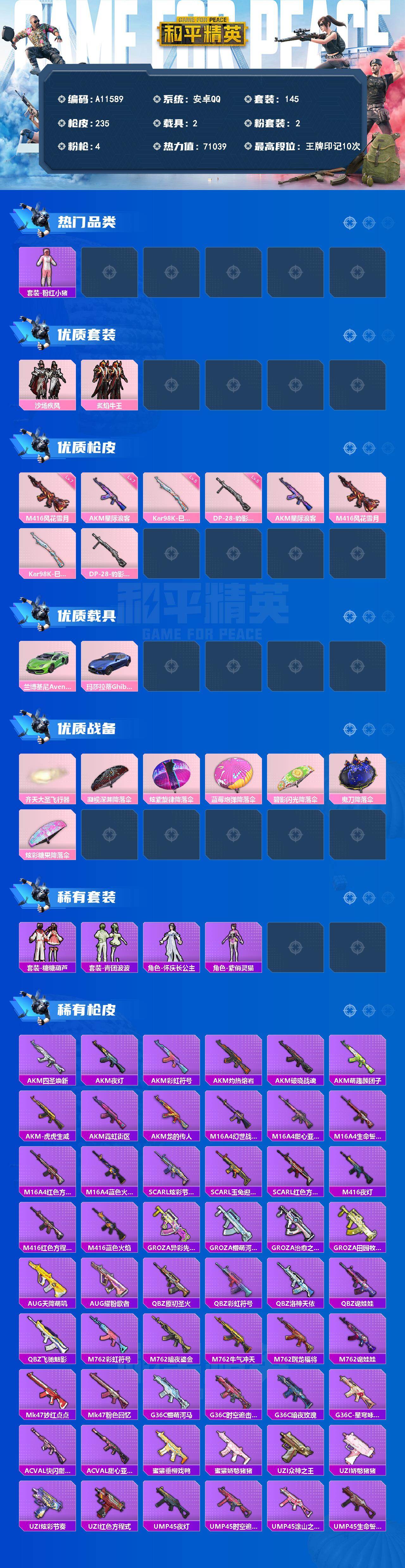 【693108】【可二次】【安卓QQ】沙场疾风 AKM-星际浪客 暗夜契约 M762-瑞龙福将 齐天大圣飞行器 蓝莓炮弹降落伞 炫紫旋律降落伞 摩登艾咪 碧影闪光降落伞 凝视深渊降落伞 机械征服者 M416-风花雪月 粉红小猪 M24-香水柠檬 瑞龙福将 醒狮腾龙 梦之呓语 雪山精英 团圆交子