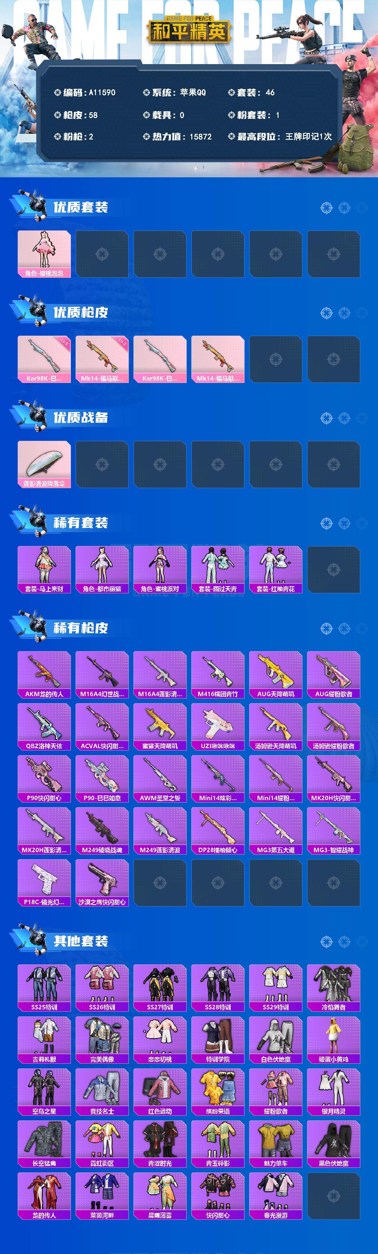 【693120】【A11590】苹果【小号/1粉装-2特效枪】 手Q--15872热力值-1王牌印记-46套装-58枪皮【粉色套装】:角色-樱桃泡泡【粉色枪皮等级】:Kar98K-巳巳如意(五级),Mk14-福马献瑞(三级)【粉色枪皮】:Kar98K-巳巳如意,Mk14-福马献瑞【粉色降落伞】:莲影清波降落伞【稀有套装】:套装-马上来财,角色-都市丽猫,角色-蜜桃派对,套装-雨过天青,套装-红釉