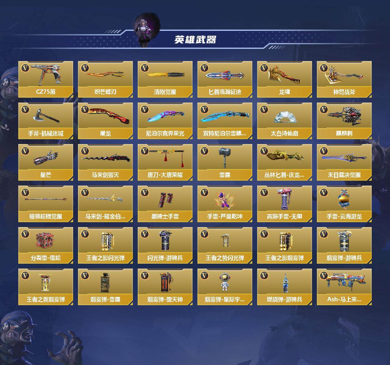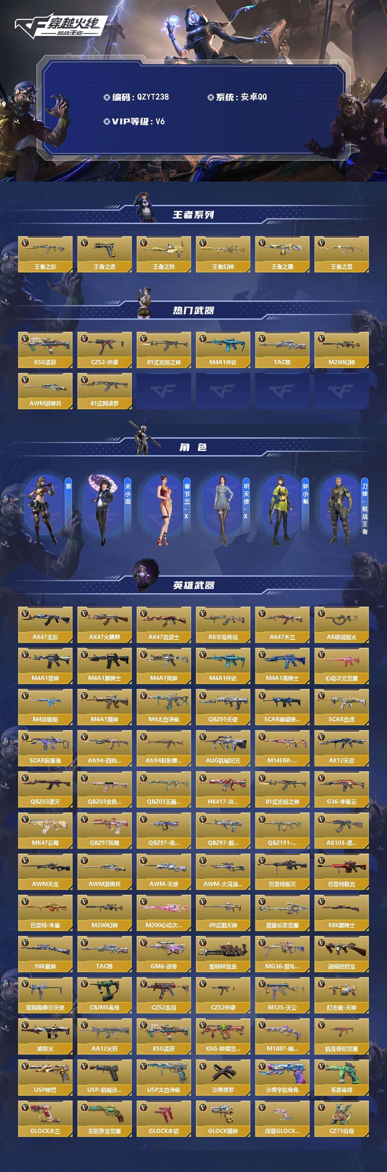 【713583】【QZYT238】VIP6/231V/王者之影/王者之迹/王者之狱/王者幻神/王者之霆/王者之尊/KSG-孟获/CZS2-仲康/81式-光明之神/M4A1-仲达/TAC-慈/幻神/AWM-游骑兵/81式-阿波罗/葵/关小雨/春节兰-X/炽天使-X/钟小魁/刀锋-枪战王者/无影/火麒麟/AK47-血武士/AK47-华夏传说/AK47-木兰/AK47-谜城烟火/雷神/黑骑士/M4A1