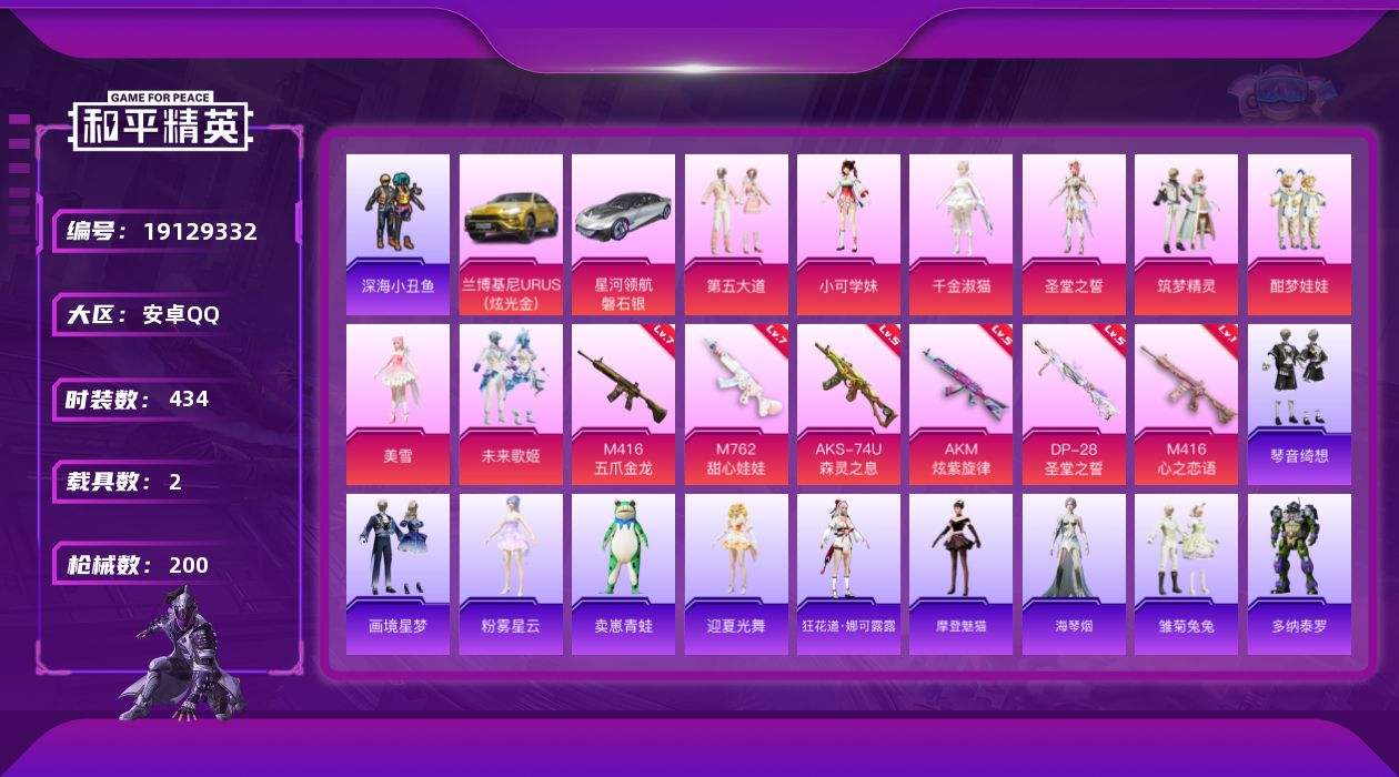【728164】【不可二次】【安卓QQ】龟仙人 M416-五爪金龙 DP-28-圣堂之誓 酣梦娃娃 龙翔九天飞行器 黄族统领飞行器 M762-甜心娃娃 AKM-炫紫旋律 星河领航(磐石银) M416-心之恋语 粉红小猪 深海小丑鱼 绿意幻情飞行器 兰博SUV金色 纯白誓言